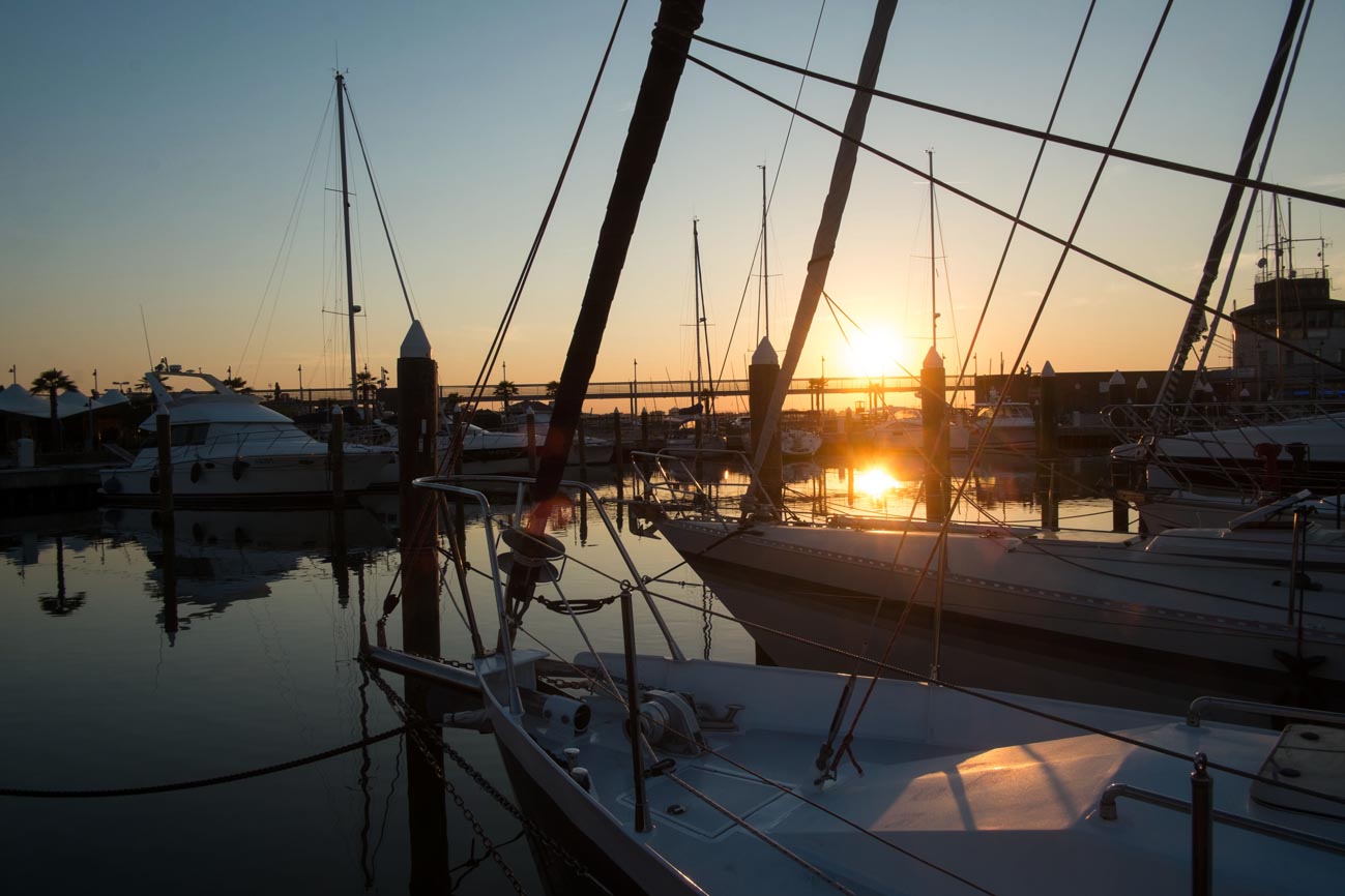 Vorm Yachthafen von Rimini fährt ein einsamer Steh-Paddler im Sonnenuntergang nach Hause.