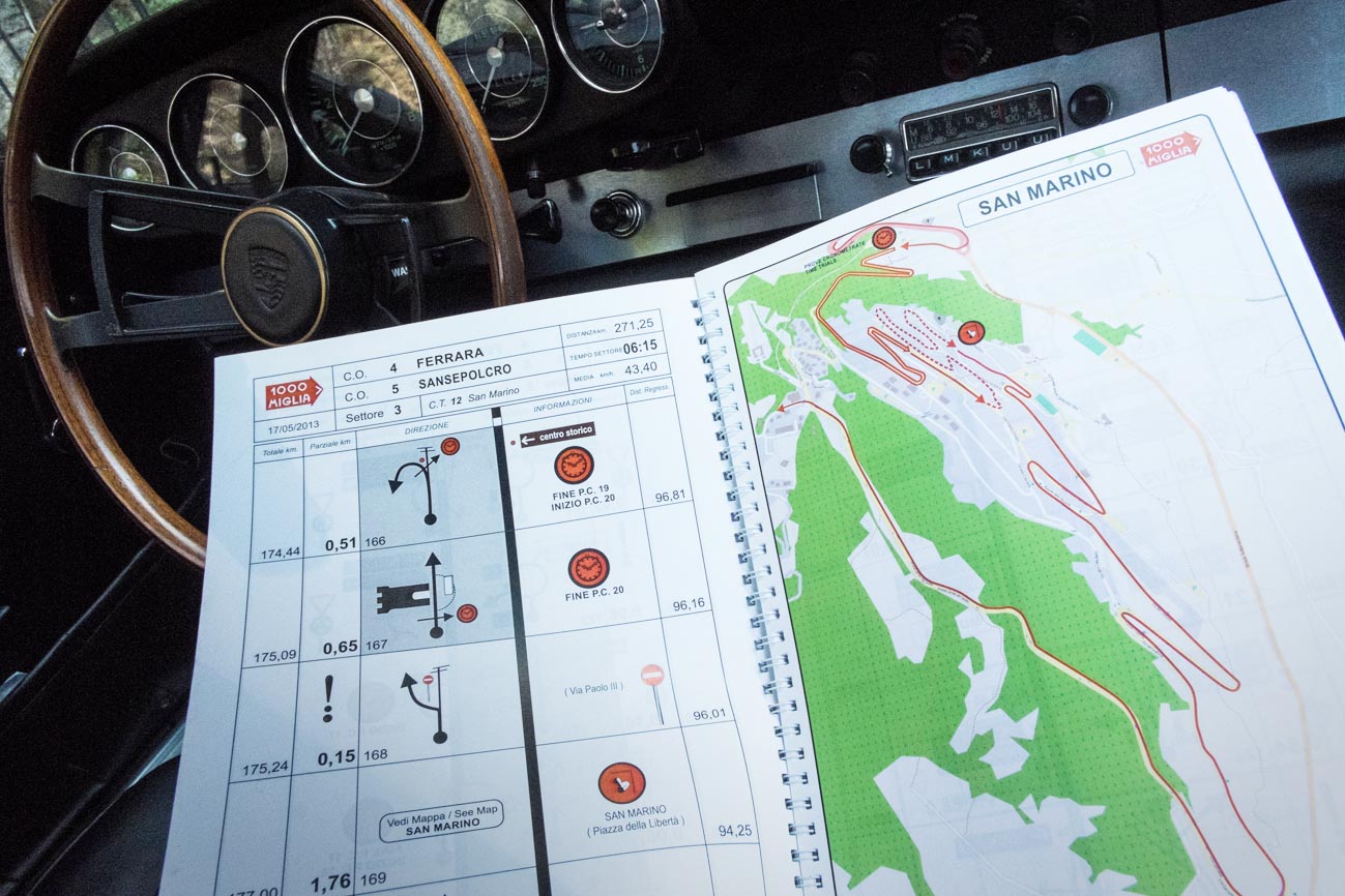 Heute ist vor allem ein Fahr-Tag. Schon morgens beim Aufbruch in Rimini herrschen 34 Grad, so sind wir froh, wenn uns wenigstens der Fahrtwind durch Papa Leones offene Fenster kühlt. Das Roadbook der Mille-Miglia-Rallye hilft uns bei der Orientierung in der engen Altstadt von San Marino, dem Stadtstätchen nur wenige Kilometer westlich. Der Anstieg ist anspruchsvoll: Kilometerlang zieht sich die Serpentinenstraße den Berg hinauf. Bei vierspuriger Verkehrsführung ist das kein Problem. Erst bei der Einengung auf zwei Spuren reagiert unser betagter Carrera hin und wieder unwirsch. Doch so weit kommt es erst ganz oben, kurz vor der Fußgängerzone.