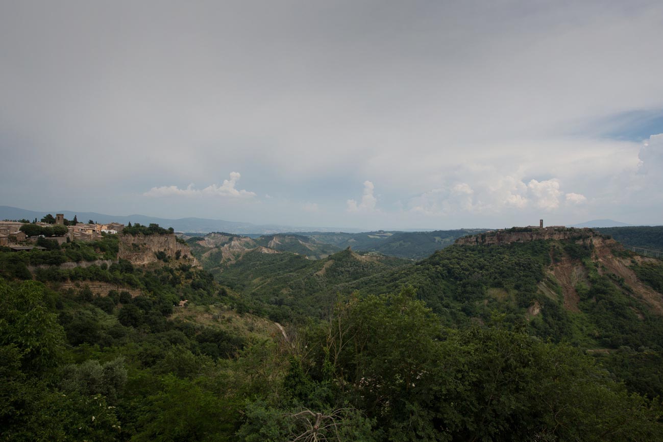 Unser eigentliches Ziel heute ist Cività de Bagnoregio, am nördlichen Zipfel des Latiums gelegen. Es wurde schon zu Etruskerzeit auf einem Berggipfel mitten in einem riesigen, fast kreisrunden Talkessel errichtet – wie ein Indianer-Pueblo. Bis heute ist das Dorf nur über eine Fußgängerbrücke zu erreichen.