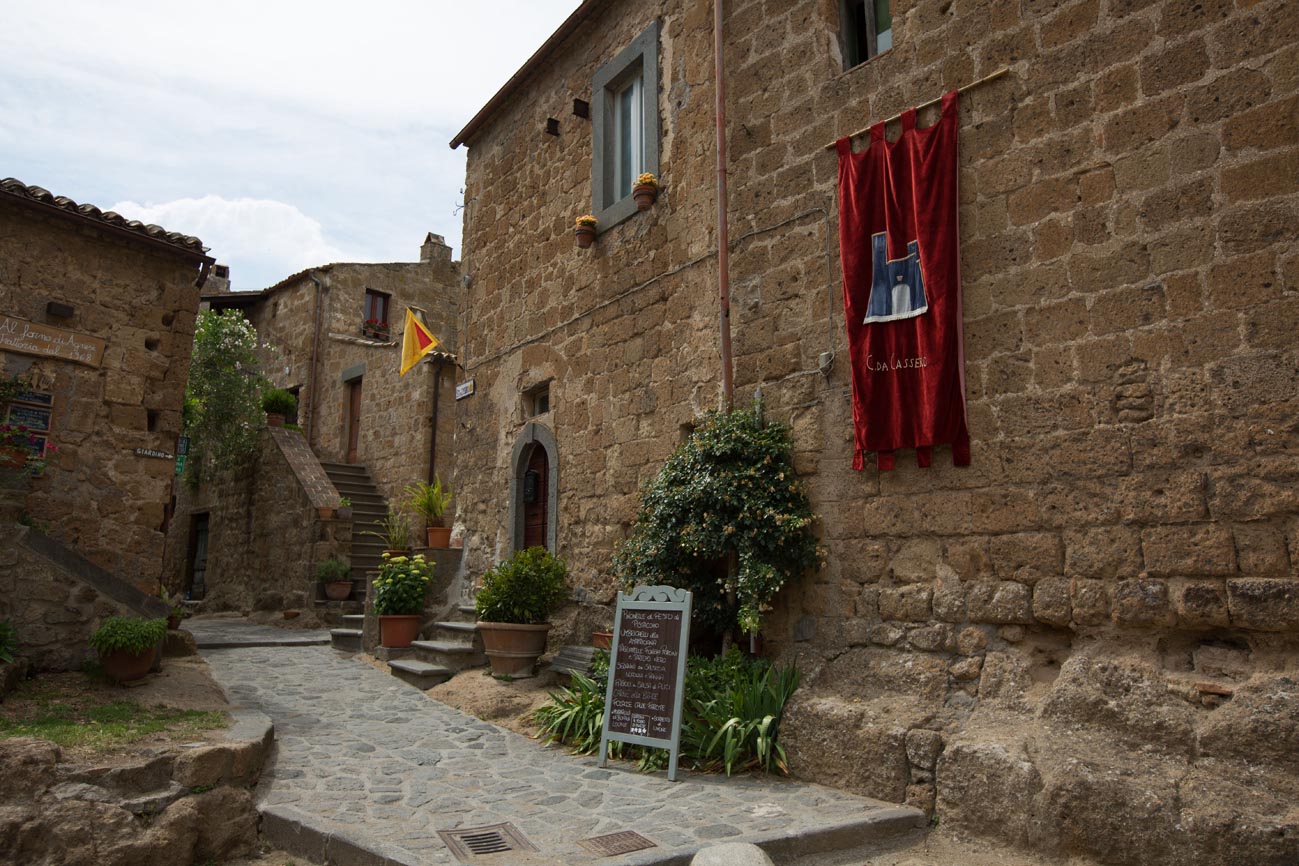 Drinnen fährt kein Auto. Die Sträßlein wären viel zu klein, die Ecken zu eng. Außerdem ist die schmale Brücke, die den Talkessel überquert und die Civit`mit Bagnoregio verbindet, nur für Fußgänger zugelassen.