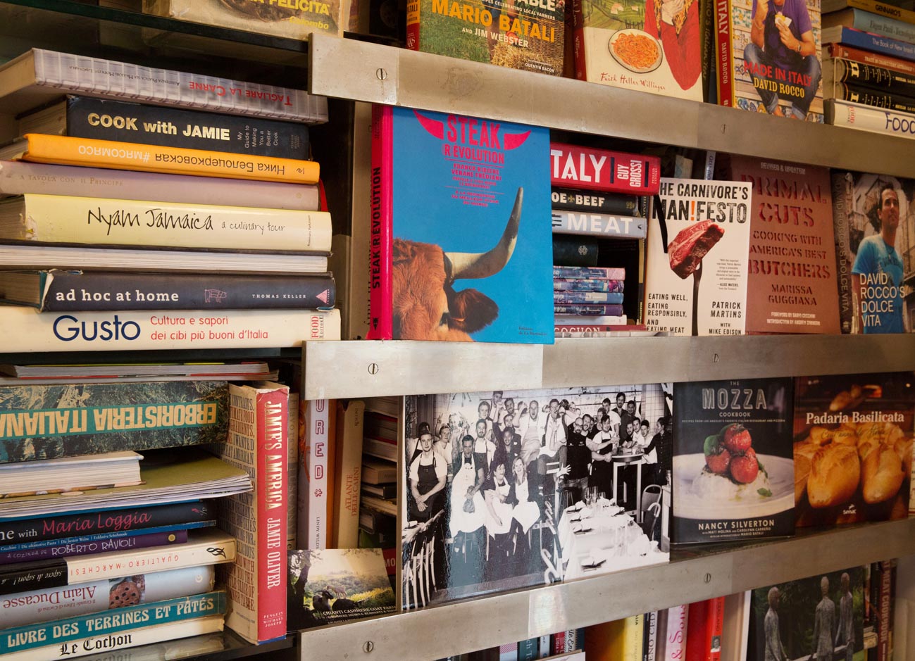 Darios Bibliothek in einer Ecke des Ladens enthält vor allem Bände zum Thema Genuss, gutes Essen, Gastlichkeit. Eines der herausragenden Werke ist das „Manifest eine Carnivoren“, also eines Fleisch(fr)essers. Und ganz rechts das passende Buch zu unserem Blog: Dolce Vita.