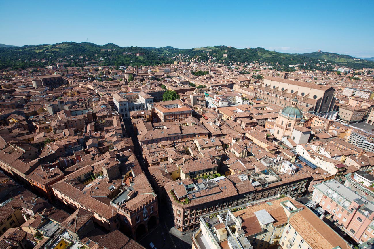 Der heutige Tag beginnt mit einem Aufstieg auf Bolognas Torre Asinelli. Der steht zwar noch geringfügig gerader als sein unmittelbarer Nachbar, der Torre Garisenda – aber dafür ist mehr als doppelt so hoch. Etwa 1000 Stufen sind zu bewältigen, bis sich auf 97 Meter eine einmalige Aussicht über Bolognas Altstadt, die umliegenden Viertel und die weitere Umgebung bietet.